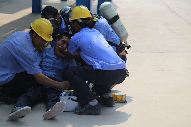 演练进行的是模拟山东半岛注册网(中国区)首页化学有限公司液氯罐区泄漏事故。演练现场,事故造成现场职工轻度中毒。现场工作人员发现泄露后,立即向调度指挥中心报告,救援人员第一时间对轻度中毒的工作人员进行简单救治,并立即拨打120请求增援。公司同时启动液氯罐区泄漏事故应急预案,派出抢修人员对泄漏点进行紧急抢修、堵漏。在发现事故险情超出企业救援能力时,鱼台县政府启动应急预案,公安、质监、环保、卫生等有关职能部门赶赴现场,进行联同作战,根据各自的职责组织事故救援。