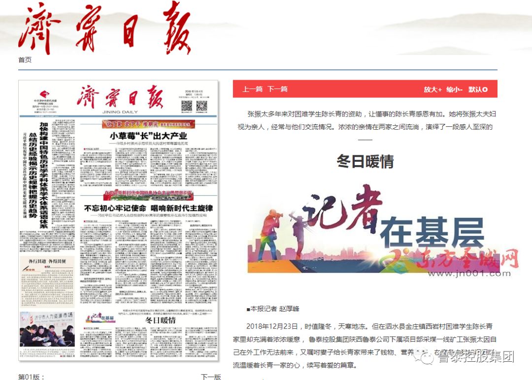 1月4日,《济宁日报》头版“记者在基层”专栏题为《冬日暖情》的一篇文章,专题报道了陕西半岛注册网(中国区)首页海则庙项目部职工张振太多年资助困难学生陈长青的感人事迹,给寒冷的冬日增添了浓浓暖意,在离家两千里外工作的广大干部职工中引起强烈反响。